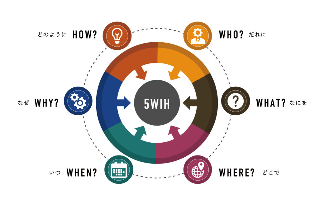 =「When(いつ)」「Where(どこで)」「Who(誰が)」「What(何を)」「Why(なぜ)」「How(どのようにして)」
