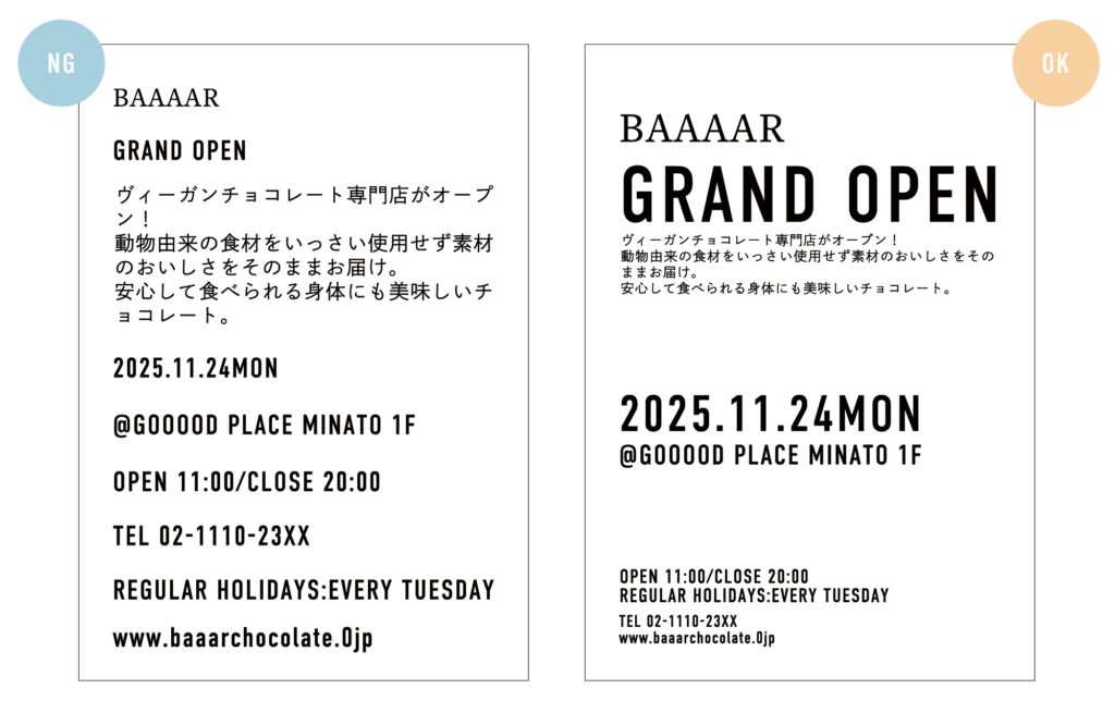 OK例のように優先順位が明らかに視覚化されていると何を一番に伝えたいのかが明確ですよね。